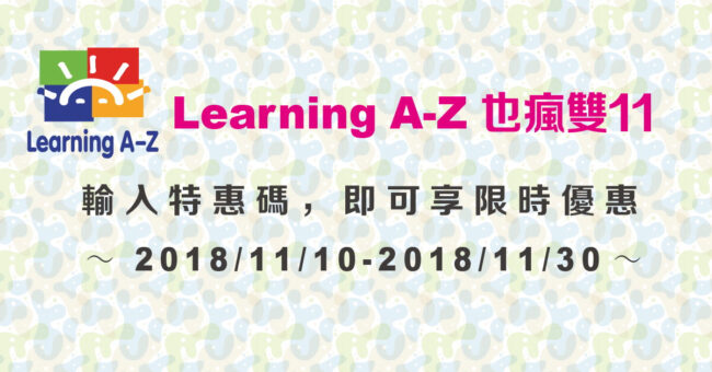 Learning A-Z 也瘋雙 11,限時優惠只到 2018/11/30 優惠訊息, 最新消息By mangoSTEEMS TW2018 年 11 月 9 日為感謝眾多使用者的支持與愛護,Learning A-Z 特別提供雙 11 限時優惠活動!